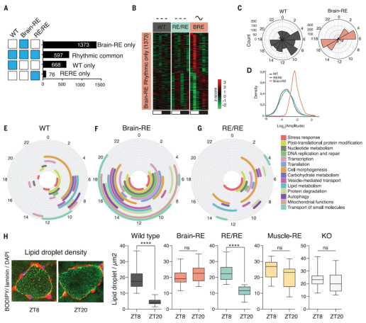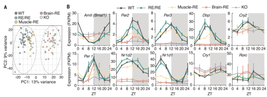 只有當大腦時鐘存在時(brain-RE)才檢測到大量不同的肌肉節(jié)律轉(zhuǎn)錄物,說明肌肉中存在大腦驅(qū)動的、非Bmal1依賴的振蕩[Fig.3A,B]。然而,這些大腦驅(qū)動的轉(zhuǎn)錄物發(fā)生了振幅和振蕩相位的改變[Fig.3C,D]。在WT小鼠的肌肉組織中,觀察到參與基本分子過程的轉(zhuǎn)錄物在休息時間(ZT0至ZT12)出現(xiàn)表達峰值[Fig.3E]。Brain-RE小鼠的肌肉組織表現(xiàn)出相位錯位,相位峰值發(fā)生在活動期。然而,RE/RE小鼠則表現(xiàn)出與WT小鼠一樣的正確排列[Fig.3E-G]。