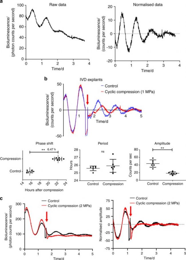 下腰痛(LBP)和 IDD 是所有年齡段人群極為常見的癥狀。機(jī)械負(fù)荷在脊柱發(fā)育和維持脊柱穩(wěn)態(tài)中起著重要作用。目前的證據(jù)表明,累積的機(jī)械應(yīng)力,尤其是過度的壓縮應(yīng)力,會損害細(xì)胞外基質(zhì)(ECM)代謝并誘導(dǎo)髓核(NP)細(xì)胞凋亡,從而導(dǎo)致 ECM 降解并最終導(dǎo)致 IDD。椎間盤(IVD)是一種高度節(jié)律性的組織,經(jīng)歷著每日的活動(dòng)/休息所施加的周期性負(fù)荷。輪班工作會擾亂人體的晝夜節(jié)律,被認(rèn)為是腰痛的危險(xiǎn)因素。有研究表明,IVD 是一個(gè)存在外周生物鐘節(jié)律的組織,該生物鐘可以通過衰老來調(diào)節(jié),并被 IL-1β 破壞。然而,異常機(jī)械負(fù)荷對 IVD 生物鐘的影響及其在 IDD 發(fā)生和進(jìn)展中的作用尚未得到探索。