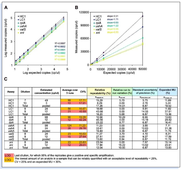 (C)Vibrio-Sequins標準品的dPCR方法驗證的相關(guān)結(jié)果。顯示的數(shù)據(jù)是三次dPCR實驗總體平均拷貝數(shù)濃度(cp/μL)和總體CV值(%),重復(fù)性(%),批間重復(fù)性(%),標準不確定度(%),以及k=2的MU不確定度。