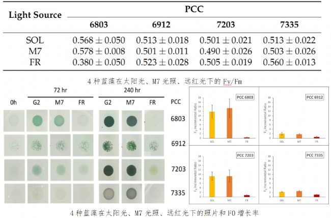 0增長率被用來衡量生長量的變化。最大光化學效率Fv/Fm則直接反映其光合效率。結果很令人驚訝,所有微藻在M7光譜條件下的生長狀況與在太陽光下類似,而且遠好于只在遠紅光下的生長狀況。M7這種奇異光譜的可見光與遠紅光比例可能是其中的關鍵因素。