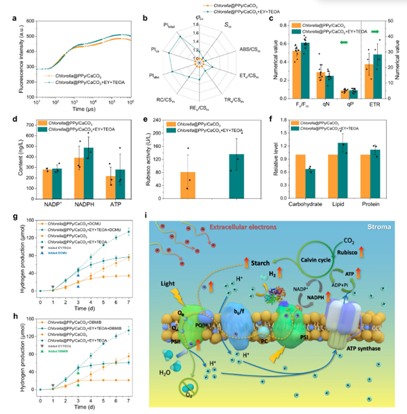 3包被細胞,葉綠素熒光曲線中的Fm增加,表明PSII中D1蛋白的活性增強,從而有助于PSII電子受體的更高效率。此外,觀察到了提高的電子傳輸量子產(chǎn)率(φEo),表明從PSII捕獲的光能更高效地用于隨后的傳遞過程。結(jié)合增強的Sm值,可以推測PQ庫被擴大,更多電子通過光合作用鏈傳遞。此外,PSII反應(yīng)中心的密度也增加,如每個CSm上減少的PSII中心數(shù)(RC/CSm)的改善所示。在光系統(tǒng)的特定能量通量方面,對于存在EY和TEOA的PPy/CaCO3包被細胞,單位激發(fā)截面(CSm)的吸收能量(ABS/CSm)和捕獲能量(TRo/CSm)均得到增強,表明葉綠素吸收了更多光能,然后用于QA的還原。此外,單位CSm的電子轉(zhuǎn)移能量(ETo/CSm)和還原終點電子受體(REo/CSm)也增加,表明還原的QA與電子傳輸?shù)脑傺趸纳疲⑶腋嗟碾娮舆_到了電子傳遞鏈的末端。這些觀察結(jié)果揭示了外部電子參與了小球藻細胞光合作用途徑,并提高了光能吸收、捕獲和傳遞的所有效率。因此,基于吸收(PIabs)、截面(PIcs)和能量轉(zhuǎn)換(PItotal)的性能指數(shù)以及Fv/Fm值均得到了顯著改善,表明PPy/CaCO3包被小球藻細胞成功內(nèi)化了外部電子,并增強了光活性。