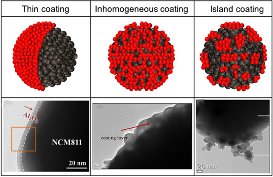 Jung 等人在早期報(bào)告中將鈷酸鋰(LiCoO2)的 UC 陰極與 PC 和 DC Al2O3 包覆的 LiCoO2 陰極進(jìn)行了比較。在報(bào)告中,PC 比 DC 表現(xiàn)出更好的容量保持率。之后,Jung 等人報(bào)道了使用 DC 方法改性的 LiCoO2 和天然石墨(NG)電極比 PC 電極具有更好的循環(huán)性能。同樣,在一些報(bào)告中認(rèn)為 PC 電極具有更好的性能,特別是在高溫環(huán)境下;也有一些報(bào)告則認(rèn)為 DC 策略更好。