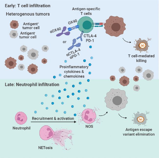 通過靶向 T 細(xì)胞的特異性療法,中性粒細(xì)胞被招募且激活,清除免疫逃逸突變體。