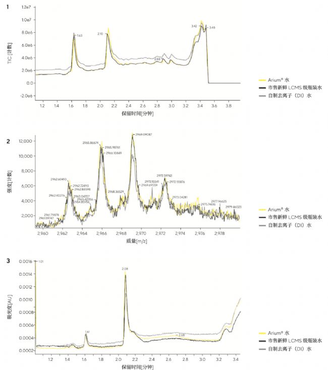 Arium® Mini UV超純水系統(tǒng)處理的水在LCMS分析中表現(xiàn)出色。與市售的瓶裝LCMS級(jí)水和設(shè)施中的去離子水相比,Arium® 水能顯著降低背景水平,提高分析靈敏度,結(jié)果更為精確和一致。