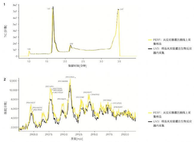 賽多利斯Arium® 實(shí)驗(yàn)室純水的具備優(yōu)越性能和可靠性,已被廣泛應(yīng)用于上游實(shí)驗(yàn)室的LCMS應(yīng)用中。圖2展示了從生物反應(yīng)器內(nèi)和灌注液路線(PERF)采集的CHO細(xì)胞培養(yǎng)物樣本的完整質(zhì)量分析結(jié)果。可以清楚地觀察到兩個(gè)樣本中糖型豐度的微小差異,以及較低的背景噪音,這些特點(diǎn)使得分析結(jié)果更加清晰和容易解讀。