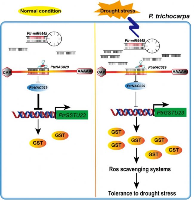 圖2 miR6445/NAC029在正常條件和干旱脅迫下的功能調(diào)控模型。