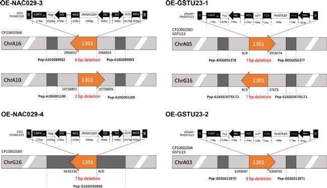 OE-GSTU-1楊樹轉(zhuǎn)基因被定位在84K楊樹的第5條和第16條染色體上,這是一個(gè)雙拷貝事件。在
