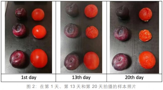 使用FX10拍攝了樣本的照片以及高光譜數(shù)據(jù)。照片顯示,番茄和李子的新鮮度隨時(shí)間明顯下降(圖2)。在其中一個(gè)番茄和李子的中間做了一個(gè)小切口,對(duì)加速番茄的老化有顯著影響,但對(duì)李子沒有影響。