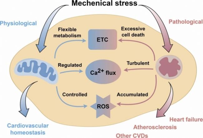 在體外,10% 的環(huán)狀單軸拉伸增加了心肌細(xì)胞的線粒體質(zhì)量和 ATP 產(chǎn)生,沒(méi)有 ROS 過(guò)度產(chǎn)生,也沒(méi)有 Ca2+ 過(guò)載;15 dynes/cm2 的剪切應(yīng)力通過(guò)降低血漿成員膽固醇來(lái)促進(jìn)內(nèi)皮線粒體 ATP 的產(chǎn)生,表明生理機(jī)械應(yīng)力對(duì)于維持線粒體能量供應(yīng)是必需的。此外,線粒體功能的機(jī)械應(yīng)力調(diào)控依賴(lài)于線粒體形態(tài)和結(jié)構(gòu)的適應(yīng)。兔心臟的攣縮、靜息和拉伸實(shí)驗(yàn)顯示,與靜息相比,拉伸誘導(dǎo)的線粒體形狀更細(xì)長(zhǎng)。線粒體網(wǎng)絡(luò)被認(rèn)為可以增強(qiáng)線粒體通訊,更快地傳輸電子,并實(shí)現(xiàn)細(xì)胞范圍的機(jī)械信號(hào)傳導(dǎo)。與靜態(tài)(0%)、異常低(6%)或病理性高(50%)幅度拉伸相比,生理性(25%)拉伸維持了線粒體網(wǎng)絡(luò)結(jié)構(gòu),使 ATP 最大化,mtROS 最小化。同樣,在產(chǎn)生單向血流的胸降主動(dòng)脈中觀察到生理性線粒體,但在血流紊亂的分叉部位則沒(méi)有。