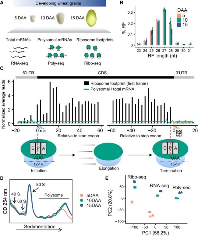 研究聯(lián)合Ribo-seq、Poly-seq和RNA-seq技術(shù),全面分析小麥籽粒發(fā)育過程中的轉(zhuǎn)錄組和翻譯組,揭示全基因組范圍內(nèi)的翻譯調(diào)控事件。