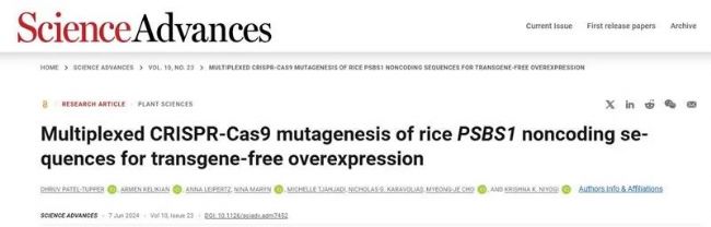 優(yōu)化光合效率是開發(fā)更可持續(xù)和高產(chǎn)作物品種的一個非常有前途的策略。這一方法有可能顯著提高田間作物的農(nóng)藝性狀,已有幾項突破性成果證明了這一點,例如構(gòu)建新的光呼吸支路、提高替代電子傳遞途徑的效率或增加熱耗散NPQ。6月7日,Science Advances在線發(fā)表美國加州大學(xué)伯克利分校植物與微生物生物學(xué)系Krishna K. Niyogi課題組題為"Multiplexed CRISPR-Cas9 mutagenesis of rice PSBS1noncoding sequences for transgene-free overexpression"的最新研究論文。報道了該研究小組通過CRISPR/Cas9工具編輯植物中自然存在的參與光保護過程的基因來改變光合作用。