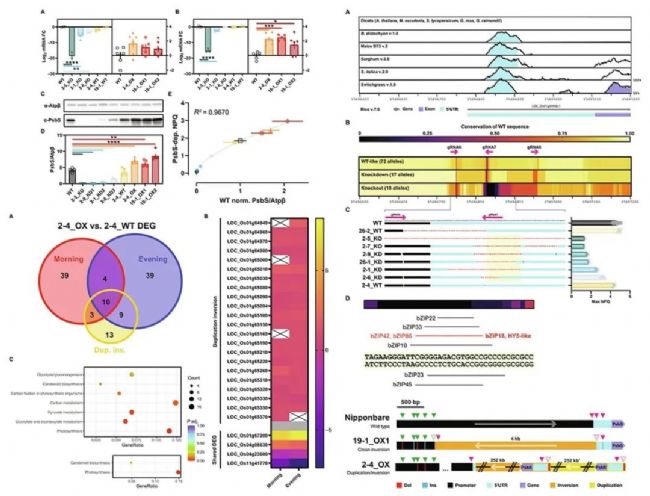 研究人員通過對水稻PSBS1基因上游的非編碼序列進行了多重CRISPR-Cas9誘變,借助利用高通量篩選方法分離出了120個基因編輯的等位基因,基因敲除到過表達(dá)使得它們在體內(nèi)具有不同的非光化學(xué)淬滅(NPQ)能力。過表達(dá)使OsPsbS1蛋白豐度增加了兩到三倍,與轉(zhuǎn)基因獲得的倍數(shù)變化相當(dāng)。PsbS 蛋白豐度的提高增強了NPQ 能力和水分利用效率。在本研究解決的遺傳變異中,研究人員發(fā)現(xiàn)了5′UTR 插入缺失和倒位在分別驅(qū)動基因敲除/敲低和過表達(dá)表型中的作用。復(fù)雜的結(jié)構(gòu)變異,如這里產(chǎn)生的252 kb的重復(fù)/倒位,證明了CRISPR-Cas9在促進基因組重大變化方面的潛力,而對轉(zhuǎn)錄組的脫靶擾動可以忽略不計。相關(guān)的研究結(jié)果可為未來針對超常等位基因的基因編輯策略提供參考,并推動了對具有加速光保護弛豫的基因編輯非轉(zhuǎn)基因水稻植物的研究。