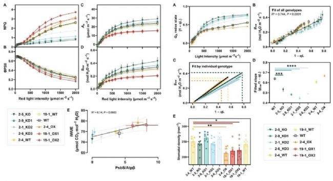 氣體交換和紅光依賴的表型研究發(fā)現(xiàn),PSBS1的過表達(dá)在非常高的光強下增加了NPQ能力,但也顯示了在中等光強下PsbS蛋白豐度和iWUE之間的強相關(guān)性。這表明除了NPQ之外,其他因素(如類囊體醌的氧化還原狀態(tài))可能參與了在不同光照條件下調(diào)節(jié)光合作用和氣孔導(dǎo)度。
