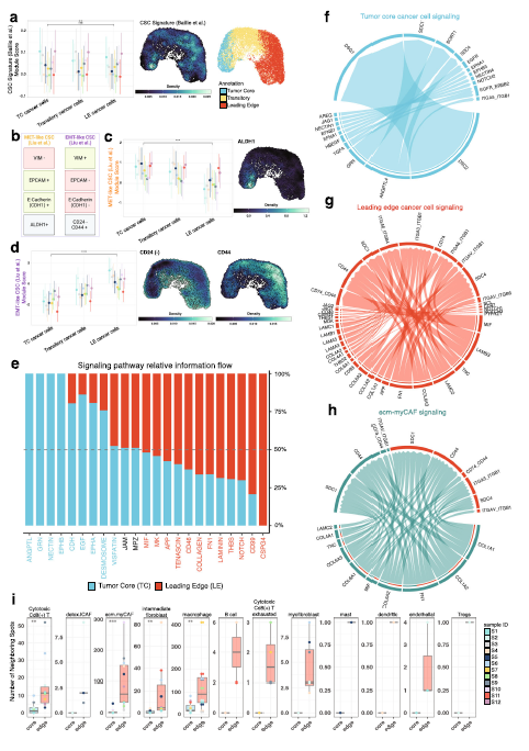 在幾個(gè)患者的同一腫瘤微環(huán)境中可能存在多個(gè)分子亞型,但亞型組成的模式并不一致?傮w來說,基礎(chǔ)亞型的TC狀態(tài)最豐富,而非典型亞型的TC狀態(tài)最豐富。典型的OSCC標(biāo)記物在LE和TC之間的表達(dá)沒有顯著差異。此外,在整個(gè)UMAP投影中,CSC標(biāo)記物的表達(dá)均勻,表明CSC群體在整個(gè)OSCC腫瘤中均可見。TC和LE的獨(dú)特生物學(xué)譜可以通過獨(dú)特的癌細(xì)胞狀態(tài)的存在來解釋——保守的基因表達(dá)程序從特定的腫瘤微環(huán)境相互作用中動(dòng)態(tài)表現(xiàn)出來——包括CSC和非干細(xì)胞樣惡性細(xì)胞。先前探索動(dòng)態(tài)CSC狀態(tài)的文獻(xiàn)提出,LE中存在間充質(zhì)樣CSCs,TC中存在上皮樣CSCs。當(dāng)將與這些不同的CSC狀態(tài)相關(guān)的基因集評(píng)分到ST數(shù)據(jù)集時(shí),結(jié)果證實(shí)了LE中間充質(zhì)樣CSC狀態(tài)存在高充質(zhì)樣CSC表達(dá),TC中存在上皮樣CSC狀態(tài)。通過對(duì)連續(xù)組織切片的免疫熒光染色,進(jìn)一步驗(yàn)證了這些CSC狀態(tài)的定位,發(fā)現(xiàn)CD24標(biāo)記在TC,CD44標(biāo)記在LE。這些發(fā)現(xiàn)加強(qiáng)了TC和LE生態(tài)位內(nèi)的可塑性,從而促進(jìn)轉(zhuǎn)錄獨(dú)特的癌細(xì)胞狀態(tài)的繁殖。