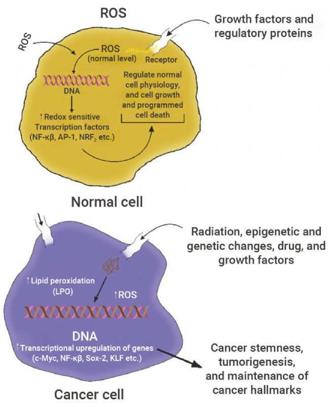 氧化應(yīng)激在癌癥特征 (如血管生成、侵襲性、干細(xì)胞和轉(zhuǎn)移能力) 中起著重要作用:癌細(xì)胞是代謝活躍且缺氧的細(xì)胞,由于大量生長和血管灌注不足,往往會產(chǎn)生更多的 ROS,ROS 通過線粒體膜擴(kuò)散損傷 DNA,同時(shí)還充當(dāng)信號轉(zhuǎn)導(dǎo)信使,參與細(xì)胞存活、治療耐藥性等。