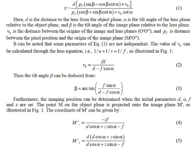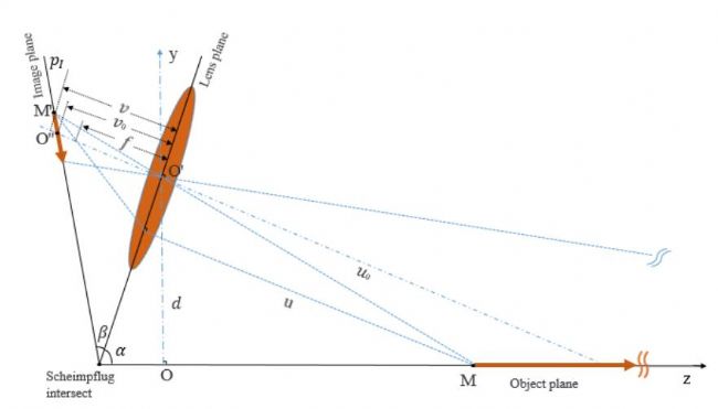 According to the Scheimpflug principle, when the lens and object planes are not parallel, the image plane will intersect both the lens and object planes. Theoretically, an infinite focus depth can be achieved despite using a large optical aperture.