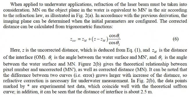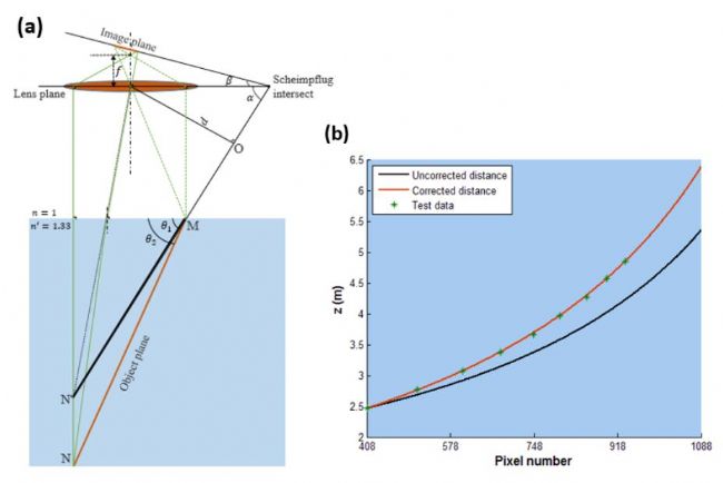 Fig. 2. Scheimpflug principle applied to the underwater environment. (a) The light path which indicates that refraction of the laser beam must be taken into consideration. (b) The relationship between pixel number and distance with optical parameters: d = 0.306 m, f = 55 mm, α = 84°.