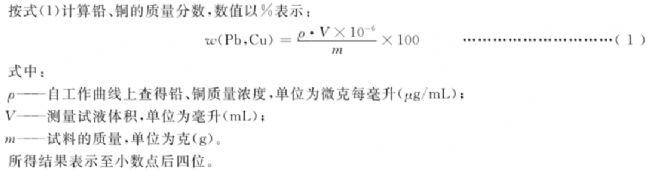 6.4.2使用空氣-乙快火焰,于原子吸收光譜儀波長鉛 283.3 nm,銅 324.7 nm 處,與系列標(biāo)準(zhǔn)溶液同時,以水調(diào)零,測量溶液的吸光度。所測得的吸光度減去試料空白試液的吸光度,從標(biāo)準(zhǔn)工作曲線查出鉛、銅的濃度。