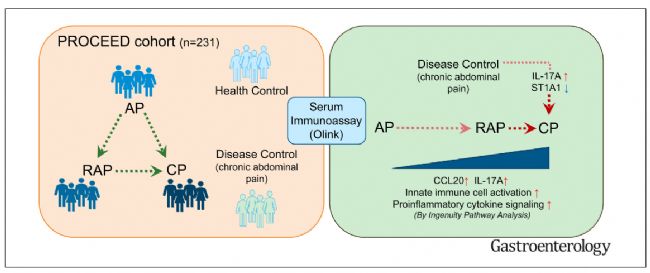急性胰腺炎(AP)在某些情況下可進展為復發(fā)性急性胰腺炎(RAP)和慢性胰腺炎(CP),目前,尚無獲批的胰腺炎治療方法或早期診斷或預后生物標志物。本文使用Olink技術,評估了參與慢性胰腺炎、糖尿病和胰腺癌(CPDPC)聯(lián)盟的慢性胰腺炎流行病學和轉化研究(PROCEED)前瞻性評價研究的參與者血清樣本中92種免疫標志物的蛋白水平。樣本分別來自無胰腺疾。╪=56)、患有慢性腹痛(CAP)(n=24)、AP(n=38)、RAP(n=56)和CP(n=57)的個體。共有33種免疫標記物在胰腺炎組與對照組差異表達。與IL17信號相關的免疫標記物將CP與AP和RAP區(qū)分開來,IL17A和CCL20將CP與CAP區(qū)分開,表明TH17細胞可能參與CP發(fā)病機制,2種免疫標志物(IL17A和ST1A1)可區(qū)分CP和CAP。巨噬細胞經(jīng)典活化途徑在胰腺炎連續(xù)發(fā)展過程中持續(xù)升高,表明在疾病進展過程中促炎信號的積累。一些免疫標記物與吸煙、飲酒和糖尿病狀態(tài)有關。