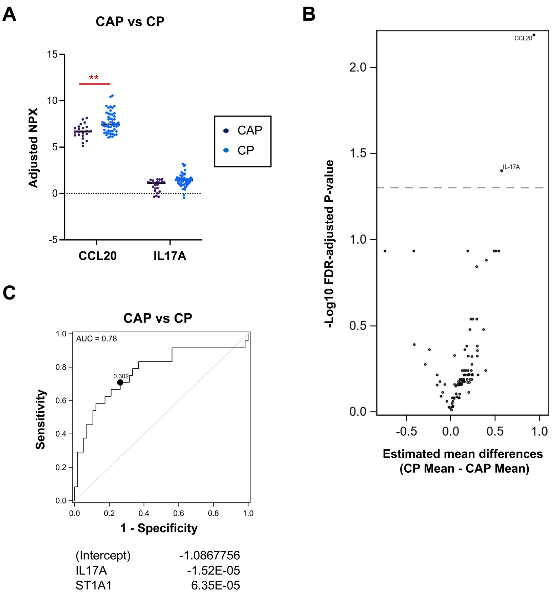 接下來,作者試圖確定區(qū)分不同類型胰腺炎的免疫標志物。分析發(fā)現(xiàn)CCL20、IL17A等5種免疫標志物在CP中與AP和RAP不同(圖2A和B)。在這5種標志物中,與單獨的RAP相比,CP中MCP2下調(diào),IL17A上調(diào)(圖2C和D)。與CAP相比,Th 17相關趨化因子和細胞因子CCL20和IL17A在CP中上調(diào)(圖3A和B),表明Th17細胞可能參與CP疾病發(fā)病機制。2種免疫標志物(IL17A和ST1A1)可以預測CP,AUC為0.78(圖3C)。