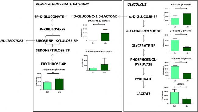圖1 與對照(Ctrl)相比,機械刺激(1 Hz)樣本中屬于糖酵解和磷酸戊糖途徑的中間體積累的變化。