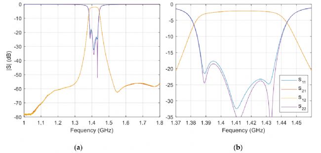 圖2,用矢量網(wǎng)絡(luò)分析儀(VNA)測量濾波器響應(yīng):(a)寬帶響應(yīng);(b)頻率y軸在保護頻帶附近變焦。