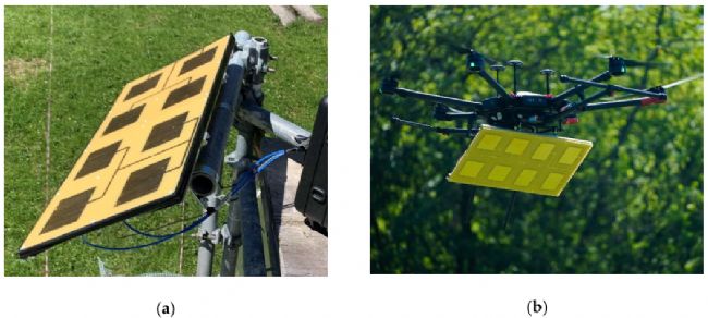 圖3,天空測量時安裝在塔上的貼片陣列天線(a);(b)在飛行測量時安裝在多旋翼無人機上。