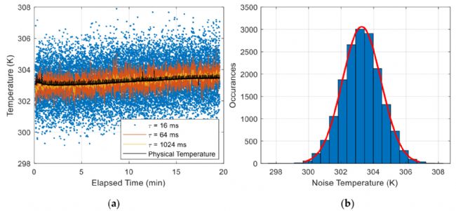 圖7,輻射計在匹配電阻源期間測量的噪聲溫度連接到輻射計的H端口,用于量化PoLRa的穩(wěn)定性。(a)不同積分時間τ的噪聲溫度時間序列隨源的物理溫度繪制。(b) (a)所示原始τ = 16 ms樣本的直方圖和分布的高斯擬合。