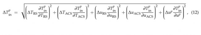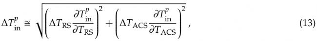 其中Δ前綴表示與前一個變量相關(guān)的不確定性。測量電壓uRS、uACS、up的系統(tǒng)不確定度ΔuRS、ΔuACS、Δup均為0.01 mV。當通過增益G (~5 K/mV)的乘積轉(zhuǎn)換為溫度單位時,這些不確定性遠小于TRS, TACS的測量物理溫度ΔTRS = ΔTACS≃1K。因此式(12)可化簡為: