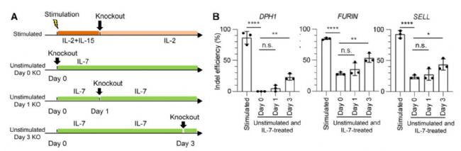 圖4.在未激活的T細(xì)胞中,IL-7預(yù)處理可增強(qiáng)基因編輯效率。(A)電穿孔實(shí)驗(yàn)方案示意圖。將未激活的T細(xì)胞在IL-7的存在下培養(yǎng),指定的時間段用Cas9/gRNA電穿孔,(B)所示數(shù)據(jù)為每種情況下靶向DPH1、FURIN和SELL的gRNA的估計指數(shù)百分比。