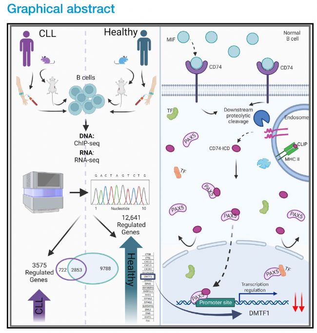 在本研究中,作者研究了CD74-ICD在正常B細(xì)胞中的轉(zhuǎn)錄和調(diào)控功能。發(fā)現(xiàn)激活后CD74-ICD在胞質(zhì)溶膠中與轉(zhuǎn)錄因子(如PAX5)形成復(fù)合物,并且與CLL細(xì)胞中的結(jié)合相比,染色質(zhì)在位點(diǎn)數(shù)量明顯增加。這些結(jié)合基因主要部分的表達(dá)在惡性細(xì)胞中被關(guān)閉。CD74-ICD:PAX5復(fù)合物結(jié)合抑癌基因 DMTF1 的啟動子區(qū)域,并通過抑制轉(zhuǎn)錄下調(diào)其表達(dá)。這些發(fā)現(xiàn)可以幫助確定在致癌轉(zhuǎn)化過程中受到調(diào)節(jié)的新治療途徑,并成為未來治療的靶點(diǎn)。