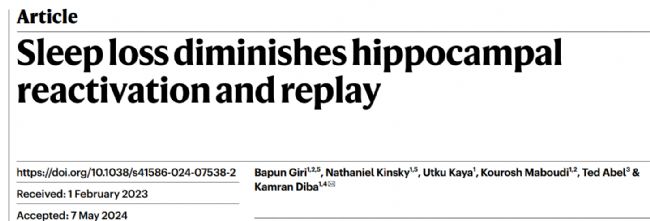 2024年6月12日,密歇根大學(xué)安娜堡分校Kamran Diba 教授團(tuán)隊(duì)在Nature發(fā)表題為“Sleep loss diminishes hippocampal reactivation and replay”的研究論文,發(fā)現(xiàn)睡眠不足通過(guò)破壞海馬尖波漣漪,阻礙神經(jīng)元放電模式的重激活和回放,損傷學(xué)習(xí)記憶能力。