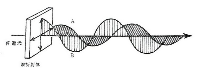 晶體在光學(xué)性質(zhì)上具有雙折射性,也稱各向異性,即光線在通過晶體時,分解成兩種振動方向互相垂直且傳播速度不等的偏光,如上圖光經(jīng)過晶體(雙折射體)后,被分解成A光和B光兩個偏振光,他們方向相互垂直,但相位不同,其差異與雙折射體厚度相關(guān)。