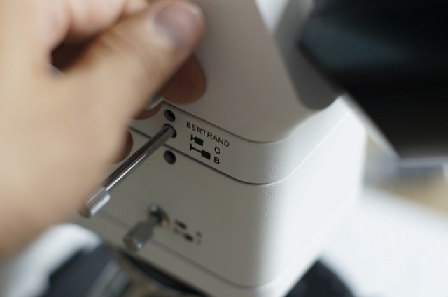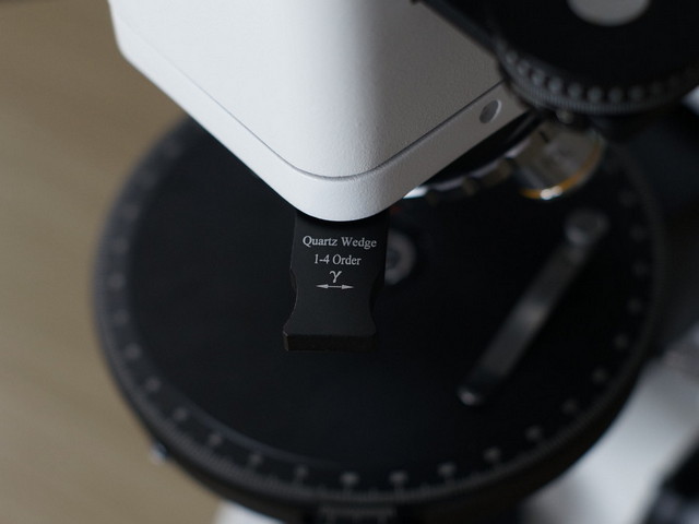 ④勃氏鏡(Bertrand Lens):勃特蘭透鏡在錐光觀察時使用,用于形成干涉圖,干涉圖的形態(tài)因晶體的光性和切片方向而不同,可借以鑒別晶體的軸性、切片類型、光性符號等屬性。必須搭配無應(yīng)力物鏡使用。