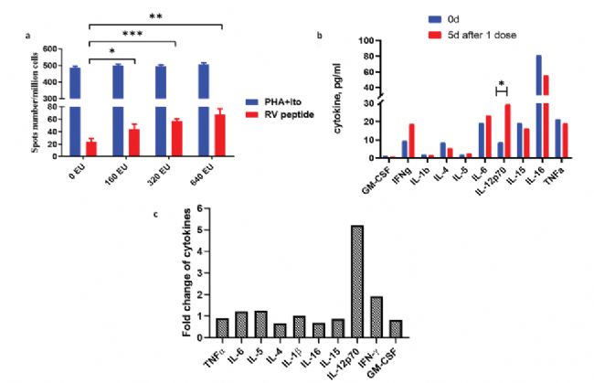 (a)最后一次免疫接種后第2周猴IFN-γ應答情況;(b)血漿細胞因子(TNF-α、IL-6、IL-5、IL-4、IL-1β、IL-16、IL-15、IL-12p70、IFN-γ和GM-CSF)通過innoscan 300定量分析(*:p<0. 05;**: p<0. 01;***: p<0.001(c) 疫苗接種后細胞因子(TNF-α, IL-6, IL-5, IL-4, IL-1β, IL-16, IL-15, IL-12p70, IFN-γ和GM-CSF)的倍數(shù)變化(*: p<0. 05)