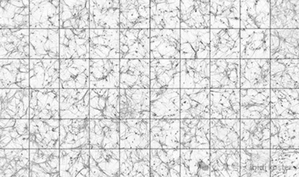 人類誘導(dǎo)多能干細(xì)胞 (hiPSC) 衍生的神經(jīng)元用 MAP2 染色,MAP2 是細(xì)胞體和近端樹突的標(biāo)記。神經(jīng)元通過神經(jīng)原素 2 誘導(dǎo)分化,并與小鼠神經(jīng)膠質(zhì)細(xì)胞共培養(yǎng) 30 天。每個方格都從 ibidi µ-Plate 96 孔方格的單獨孔中記錄。圖像記錄在具有 10 倍物鏡的高內(nèi)涵共聚焦成像系統(tǒng)上。圖片由美國馬薩諸塞州劍橋 Q-State Biosciences, Inc. 的 Chris Hempel 提供。