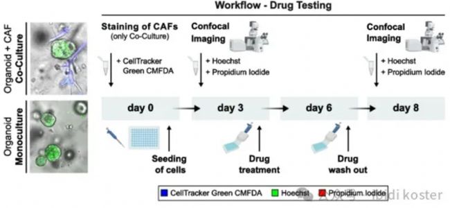 PDAC-PDO 單一培養(yǎng)和 PDAC-PDO/CAF 共培養(yǎng)的已建立藥物測試工作流程的示意圖概述。