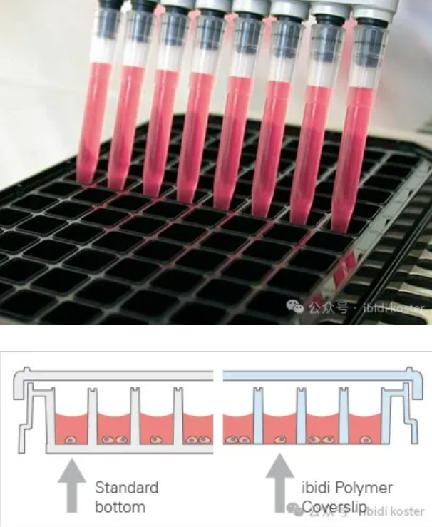 標(biāo)準(zhǔn)96孔板底部由聚苯乙烯制成,厚度為 1 毫米,不適合高分辨率或熒光顯微鏡。ibidi96孔板帶有平坦的ibidi 聚合物蓋玻片 #1.5 底部(180 µm,+10/-5 µm),非常適合高分辨率或熒光顯微鏡。