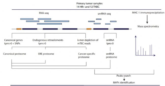 該研究選取了26例原發(fā)性乳腺癌樣本:HR+ (ER或PR陽(yáng)性,HER2陰性;n=14)或TNBC (ER/PR/HER2陰性;n=12),腫瘤組織通過(guò)免疫沉淀獲得MHC I免疫組,通過(guò)RNA-seq構(gòu)建個(gè)性化數(shù)據(jù)庫(kù),并使用PEAKS X Pro在相關(guān)數(shù)據(jù)庫(kù)中檢索LC-MS/MS數(shù)據(jù)(方法如下圖所示),隨后對(duì)鑒定出的免疫肽進(jìn)行差異基因表達(dá)分析,免疫原性分析,特異性T細(xì)胞功能擴(kuò)增(FEST)試驗(yàn)以及TAAs和aeTSAs的數(shù)量是否與TCGA中患者的總生存期相關(guān)分析。