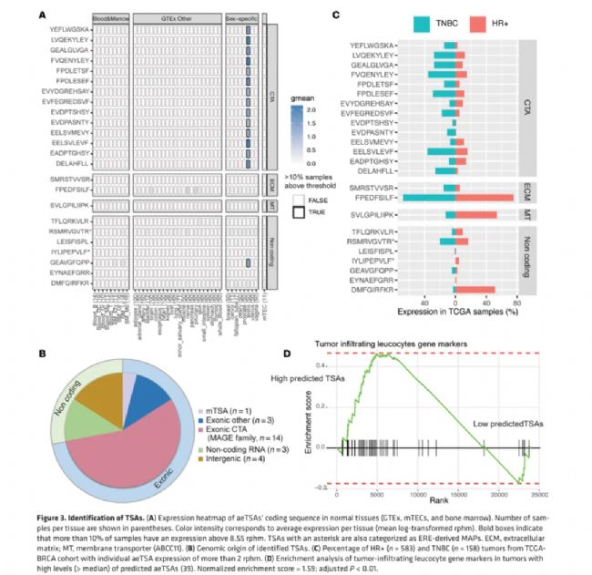 在24個(gè)aeTSAs中,17個(gè)由典型外顯子編碼:14個(gè)來(lái)源于癌胚抗原(CTA)的MAGE family CTAs家族,2個(gè)來(lái)源于編碼細(xì)胞外基質(zhì)成分的基因(COL11A1, ITH6),1個(gè)來(lái)源于跨膜蛋白編碼基因(ABCC11);7個(gè)aeTSAs來(lái)源于非蛋白質(zhì)編碼區(qū),2個(gè)與EREs重合,為ERE-derived MAP(圖3)。統(tǒng)計(jì)發(fā)現(xiàn),TNBC樣品中aeTSAs 更豐富(圖2 B)。研究者進(jìn)一步評(píng)估TNBC樣本中aeTSAs的豐富鑒定是否與TCGA隊(duì)列中的TSA表達(dá)相關(guān)。在TNBC中,表達(dá)癌胚抗原 (CTA)類腫瘤個(gè)體aeTSAs的比例高于HR+腫瘤(19%比8%,P = 0.004)(圖3C)。將乳腺癌TCGA樣本分為高(高于中位數(shù))和低(低于中位數(shù))aeTSAs數(shù)量?jī)山M,使用白細(xì)胞浸潤(rùn)標(biāo)記基因進(jìn)行GSEA分析,結(jié)果顯示,這些基因在高TSA數(shù)量的腫瘤中富集(圖3D),這表明一些TSAs在體內(nèi)具有免疫原性。
