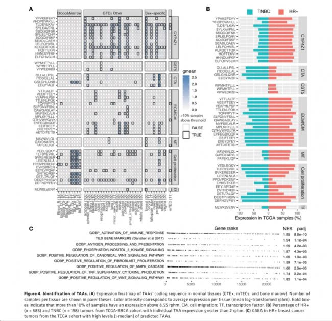 作者鑒定了49種TAAs,其中有48種來(lái)源于規(guī)范蛋白編碼區(qū)(圖4A),這些抗原在HR+和TNBC腫瘤中都具有高度的共通性(圖4B)。14種TAAs來(lái)源癌癥相關(guān)成纖維細(xì)胞(CAFs)標(biāo)志物的基因(COL11A1, COL10A1, LRRC15),這些基因與細(xì)胞外基質(zhì)的產(chǎn)生和細(xì)胞遷移有關(guān)。13種TAAs來(lái)源于CYP4Z1,它與許多癌癥類型有關(guān),并在乳腺癌患者中引發(fā)自身抗體。11個(gè)TAAs與細(xì)胞增殖有關(guān)(圖4B),其在成熟上皮細(xì)胞和血細(xì)胞中低水平表達(dá),但在骨髓祖細(xì)胞中高水平表達(dá)(圖4A)。使用與aeTSA相同的標(biāo)準(zhǔn)來(lái)預(yù)測(cè)TCGA數(shù)據(jù)集中每個(gè)腫瘤的TAAs數(shù)量(圖4C)。結(jié)果顯示高水平TAAs的HR+和TNBC腫瘤存在免疫激活和免疫抑制通路富集,包括PI3K/mTOR、Wnt/B-catenin和MAPK通路。此外,含有大量TAAs的腫瘤顯示出成纖維細(xì)胞增殖標(biāo)志物的富集。這些發(fā)現(xiàn)表明,在存在多種TAAs的情況下,抗腫瘤免疫反應(yīng)受到免疫抑制通路的激活和CAFs的積累所調(diào)節(jié)。