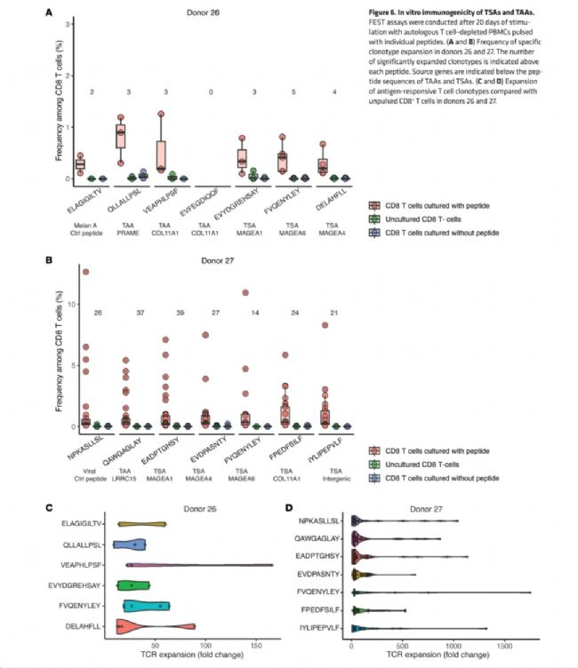 為了評(píng)估已鑒定抗原的免疫原性,作者進(jìn)行了特異性T細(xì)胞功能擴(kuò)增(FEST)試驗(yàn),檢測(cè)了2名健康獻(xiàn)血者HLA異型呈現(xiàn)的11種不同抗原(7種TSA和4種TAAs)(圖6)。陽(yáng)性對(duì)照為免疫原修飾的MelanA drived MAP(ELAGIGILTV)和呼吸道合胞病毒RSV-NL9肽(NPKASLLSL)。結(jié)果顯示7種TSAs刺激后,TCR Vβ克隆型顯著擴(kuò)增(從3個(gè)擴(kuò)增到39個(gè)),4種TAAs中有3個(gè)表現(xiàn)出2到37個(gè)克隆型的顯著擴(kuò)增,新抗原特異性TCR克隆型的數(shù)量與抗腫瘤反應(yīng)相關(guān)。這些結(jié)果顯示MAP刺激健康受試者后,免疫系統(tǒng)中存在多克隆且功能正常的TAAs和TSAs特異性T細(xì)胞,這些細(xì)胞對(duì)于腫瘤免疫治療的成功起著重要作用,有助于對(duì)抗腫瘤細(xì)胞。
