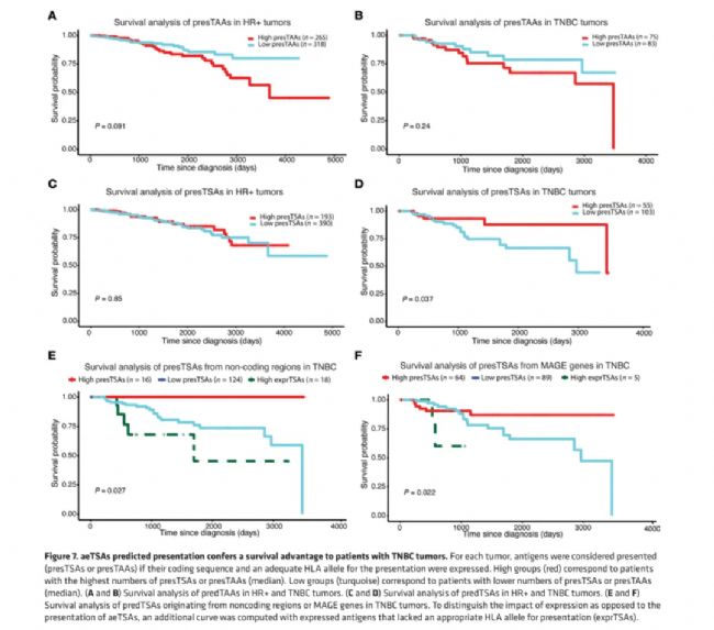 作者進(jìn)一步評(píng)估了TAAs和aeTSAs的數(shù)量是否與TCGA患者的總生存率相關(guān),結(jié)果顯示TAAs的數(shù)量對(duì)HR+或TNBC腫瘤患者的生存沒(méi)有影響(圖7A,B)。同樣,aeTSAs對(duì)HR+腫瘤患者也沒(méi)有影響(圖7C)。然而,在TNBC組中,aeTSAs越多,總生存率越高(圖7D),從MAGE基因和非編碼區(qū)提取的aeTSA中也可以觀察到這種優(yōu)勢(shì),且這種影響是受HLA限制(圖7E,F(xiàn))。因此可以得出結(jié)論,aeTSAs在TNBC患者可以提高生存優(yōu)勢(shì)(圖7D),而HR+腫瘤中沒(méi)有這種情況(圖7C),可能是因?yàn)镠R+腫瘤的aeTSAs比TNBC腫瘤更少(圖3C)。