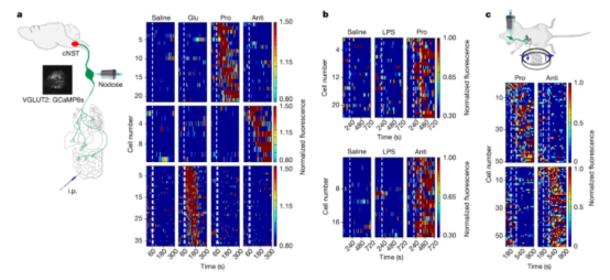使用脂多糖(LPS),一種典型免疫刺激物,來引發(fā)先天免疫反應。單劑量的LPS足以引發(fā)促炎和抗炎細胞因子的顯著增加,在注射LPS后約2小時達到峰值[Fig.1a]。c-fos檢測發(fā)現LPS引起了腦干孤束尾核(cNST)的強烈激活和Postrema(AP)區(qū)域的激活[Fig.1b]。cNST是迷走神經的主要靶點,它是體-腦軸的主要導管。鈣成像同樣證明了cNST的激活,而迷走神經的雙側膈下切斷,消除了LPS引起的cNST反應[Fig.1c]。這表明cNST激活可以追蹤先天免疫反應的出現和發(fā)展。證實了迷走神經-cNST免疫軸,并證明LPS誘發(fā)的活性不是LPS直接進入cNST神經元的結果。