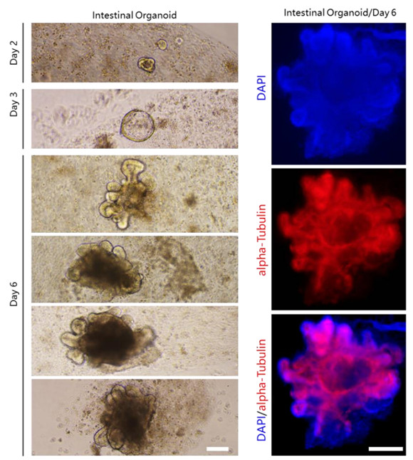 在第 2 天在 10 倍物鏡下,可觀察到小型空泡狀結(jié)構(gòu);在第 3 天可觀察到明顯變大的空泡結(jié)構(gòu);在第 6 天可觀察到具有多個(gè)出芽結(jié)構(gòu)的小腸類(lèi)器官,且培養(yǎng)皿里的類(lèi)器官可肉眼直接觀察到白色顆粒狀細(xì)胞團(tuán)。標(biāo)尺為 200 微米。