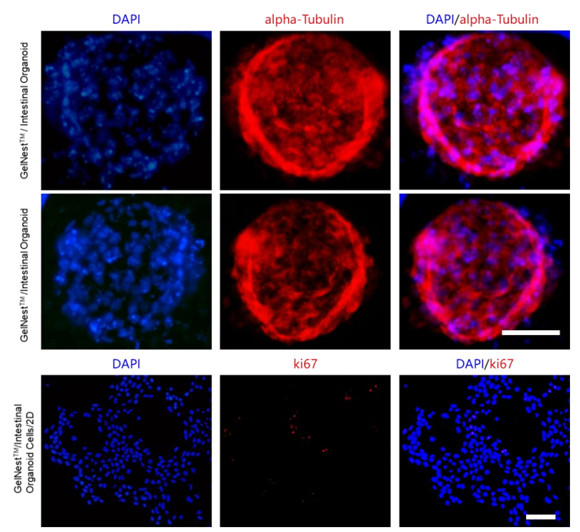 可觀察到在 GelNestTM 基質(zhì)膠中(3D)生長(zhǎng)的小腸類(lèi)器官能很好的保持生物功能性細(xì)胞標(biāo)志物的表達(dá)。