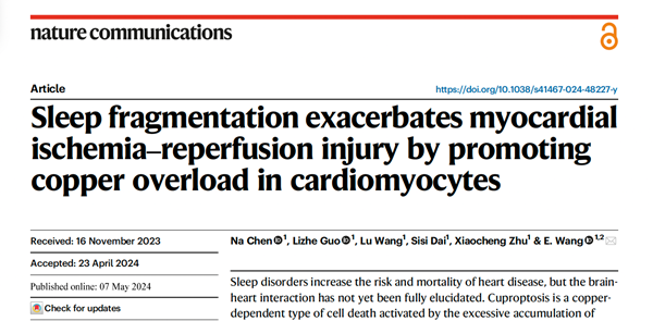 近日,中南大學湘雅醫(yī)院麻醉手術(shù)部主任王鍔教授團隊在國際著名綜合類期刊《Nature Commsunications(自然通訊)》(中科院一區(qū)Top期刊,lF=16.6)以論著形式發(fā)表了題為“Sleep fragmentation exacerbatesmyocardialischemia‒reperfusion injury by promotingcopper overload in cardiomyocytes(睡眠碎片化通過促進心肌細胞中的銅超載加劇心肌缺血再灌注損傷)”的原創(chuàng)性研究論文。中南大學湘雅醫(yī)院麻醉科陳娜博士為獨立第一作者,王鍔教授為獨立通訊作者。中南大學湘雅醫(yī)院為該論文唯一作者單位。