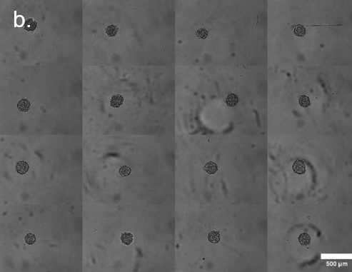 b. 分離球體在分配后4小時(shí)的存活率圖示。分析顯示分離后存活率超過98%。(比例尺 = 500 µm)