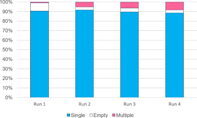 分離過程具有很高的可重復(fù)性,這一點(diǎn)可以從四次獨(dú)立分離運(yùn)行中實(shí)現(xiàn)的分離準(zhǔn)確性看出(圖 3)。