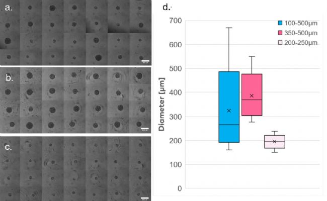 按大小排序的球體。a. 排列好的球體的顯微圖像,直徑范圍為100-500微米。b. 排列好的球體的顯微圖像,直徑范圍為350-500微米。c. 排列好的球體的顯微圖像,直徑范圍為200-250微米。d. 排列好的球體的大小分布的圖示。測(cè)量是通過使用默認(rèn)的分割工具從顯微圖像中進(jìn)行的。(比例尺 = 500微米)。